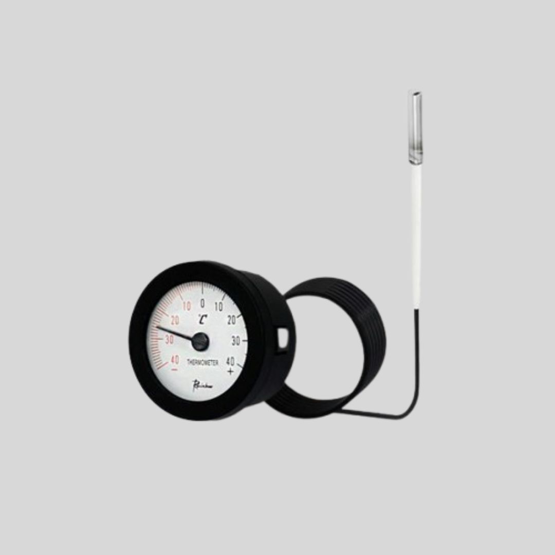 The RAINBOW THERMOMETER is a premium, heavy-duty capillary dial thermometer from trusted Rainbow series, designed for commercial ovens, tandoors, fryers, hot cases, grills, refrigeration units, and industrial kitchen appliances. Constructed with durable stainless steel capillary tube, bulb sensor, and clear analog dial for superior heat resistance, accurate temperature reading, corrosion protection, and exceptional longevity. No power required—pure mechanical operation with wide range options (e.g., -40°C to +120°C, 0°C to +300°C, or up to 320°C models) for versatile monitoring of cooking, baking, or cooling processes. Available in various capillary lengths (e.g., 500 mm to 2000 mm), dial sizes (e.g., 2–4 inch), mounting styles (surface, panel, clip-on), and temperature scales to fit different equipment models. This dependable replacement gauge ensures precise temperature control, safe operation, and uninterrupted performance in demanding heavy-duty environments, minimizing over/under-heating risks, downtime, and maintenance for optimal professional kitchen efficiency.
