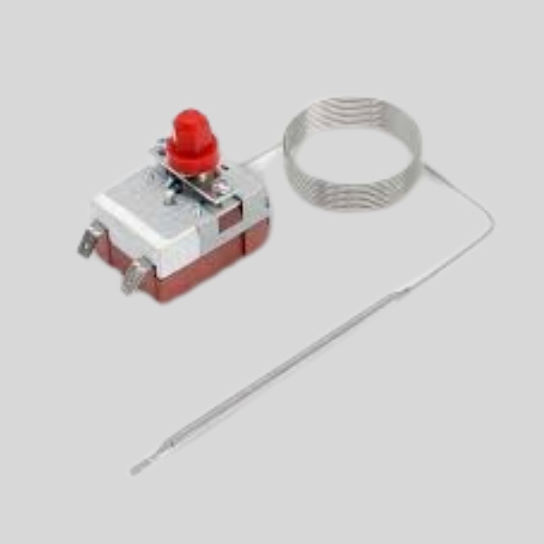 The SAFETY THERMOSTAT 110° TO 340° is a premium, heavy-duty capillary safety limit thermostat designed for commercial ovens, tandoors, pizza ovens, hot cases, fryers, grills, and industrial kitchen heating appliances. Constructed with durable stainless steel capillary tube, high-temperature sensor bulb, and robust switch mechanism for superior heat resistance, accurate temperature cutoff (adjustable or fixed set points from 110°C to 340°C), manual reset button, and exceptional longevity. Provides critical over-temperature protection by automatically interrupting power to heating elements when limits are exceeded, preventing fire hazards and equipment damage. Available in various capillary lengths (e.g., 500 mm to 2000 mm), bulb sizes, and mounting styles to fit different oven/tandoor models and safety requirements. This dependable replacement part ensures safe, reliable operation, compliance with kitchen safety standards, and uninterrupted performance in demanding high-temperature environments, minimizing overheating risks, downtime, and maintenance for optimal professional kitchen safety and efficiency.